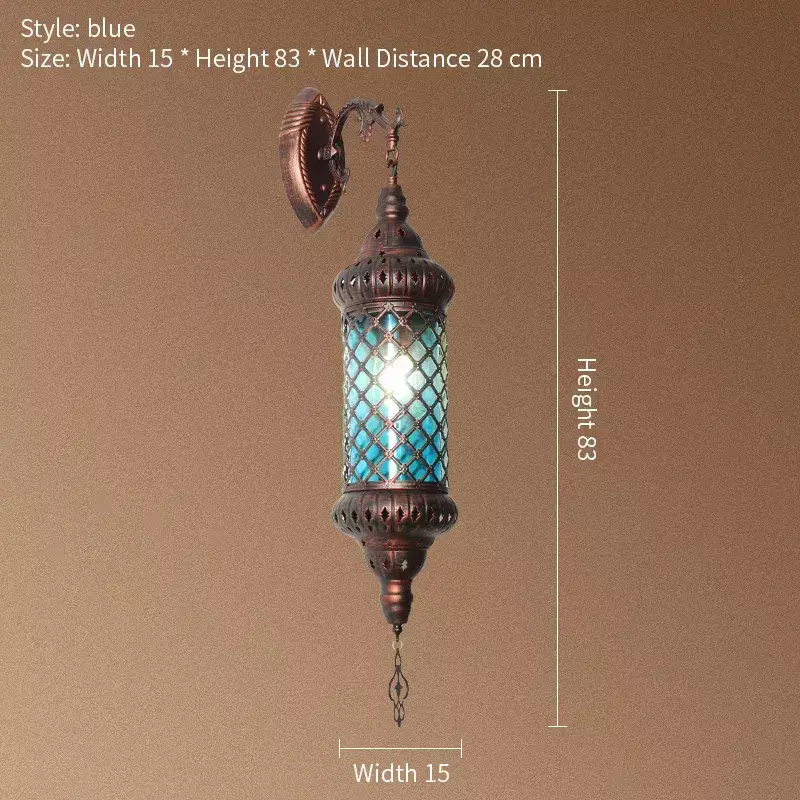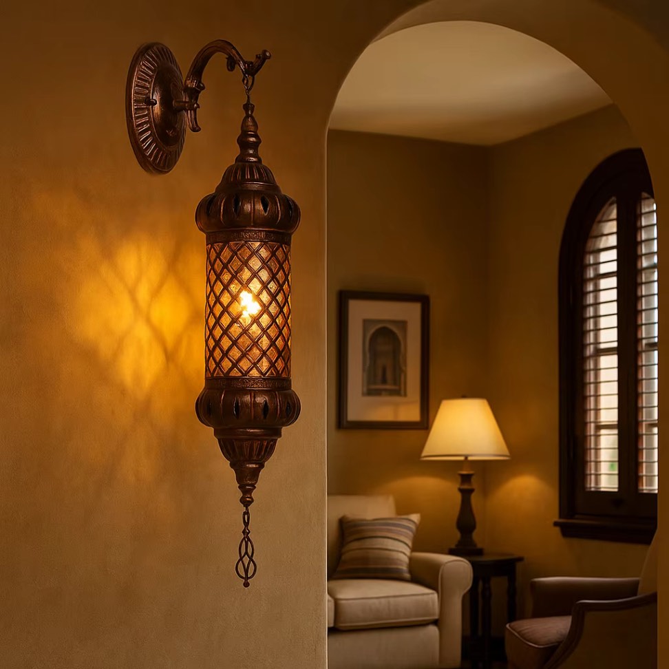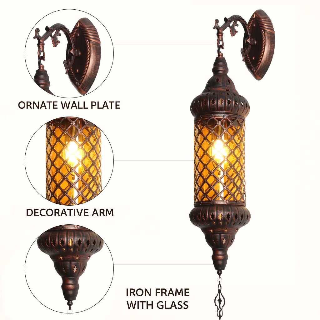 Traga o charme do Oriente Médio para o seu espaço com este candeeiro de parede árabe de estilo vintage.Fabricada em metal durável com acabamento em bronze antigo, a lanterna apresenta um abajur de vidro âmbar com padrão intrincado que emite um brilho quente e aconchegante.Com 83 cm de altura, esta peça marcante adiciona elegância e toque exótico a corredores, salas de estar, cafés e locais temáticos.Esteja você decorando uma vila tradicional, um café retrô ou um salão de luxo, esta arandela suspensa cria uma atmosfera convidativa e artística.